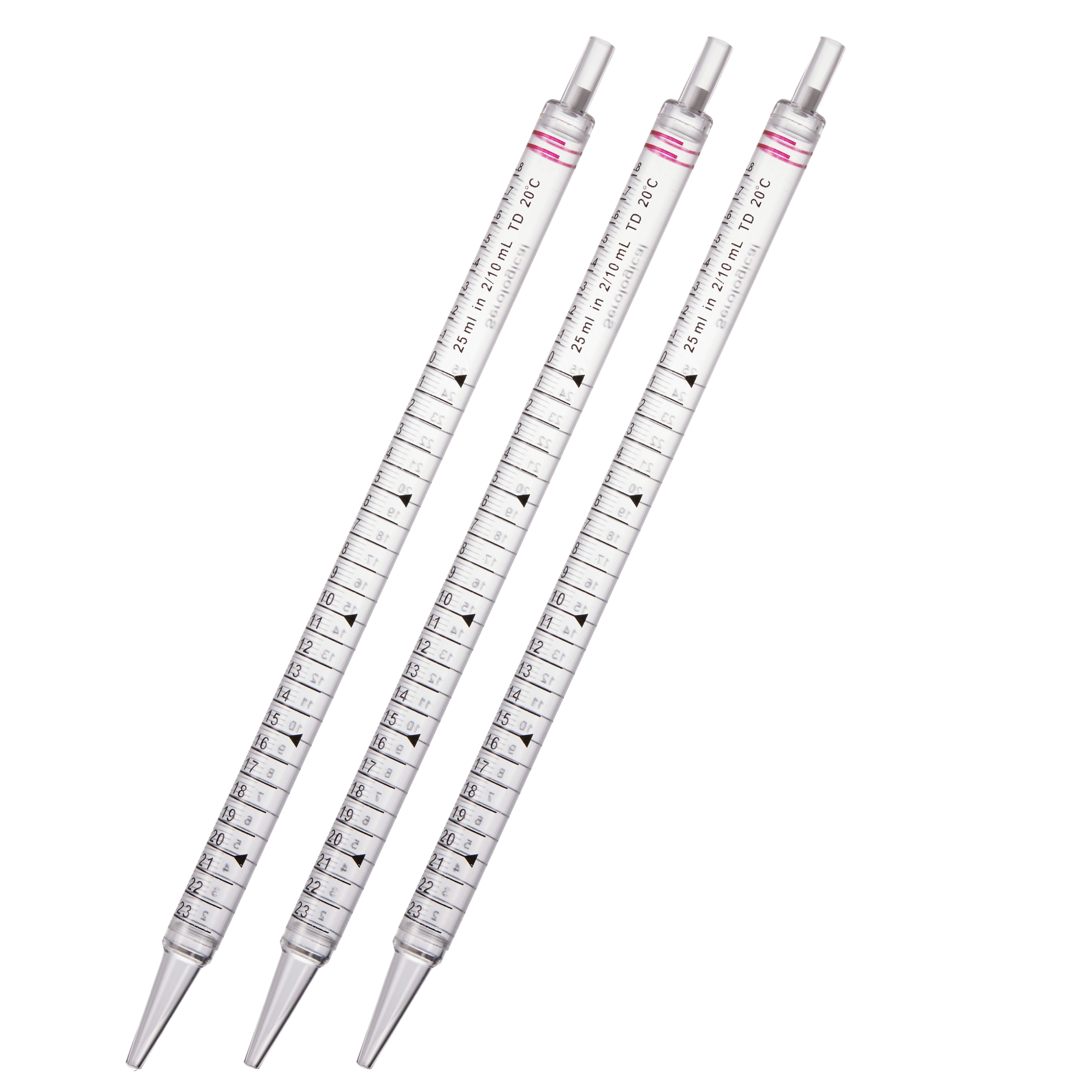 25 mL血清移液管,刻度2/10,焊接型,紅(hóng)色色環,獨(dú)立紙塑,内盒裝,滅菌,50支/盒,4盒/箱